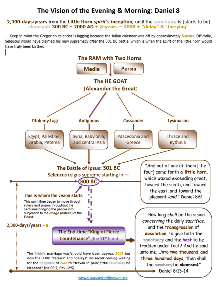 Although the vision in Daniel 8 encompasses a very broad time span, its focus is on "when" the time of the end would begin if we are to count down from the "little horn's" inception. More precisely though, from the time when the spirit of the little horn (meaning small in power) would begin to come forth. However, one must remember three things when calculating anything in the Bible. The first is that no one can really tell the exact precise year that we are in due to the various ways the different calendars where calculated throughout the thousands of centuries. Second, God teads to use exact 30-day months and 360-day years when it comes to revealing prophetic events, but not always! And thirdly, God said that even if man were able to set accurate dates, he would never know "the day nor the hour..." because He, Christ, is going to delay His coming until His bride has made herself ready. In other words, right when the best and most well intended biblical scholars have calculated their best guess return date using the best science, Levitical laws, feast days, types, leap years, or whatever, Christ will not be returning then because He has already told us He must delay that return until Zion has awakened, travailed, and trimed her lamp enough to be ready to recive His fullness. And if you have read my other materials you would have seen that my best guess showed the Lord should have returned by 2008, but in true biblical order Christ is now tarrying and delaying that first "end-time" secret coming that He promised. He must do this until His true Church is brought into the place where she can receive the fullness of His power without being destroyed by it.