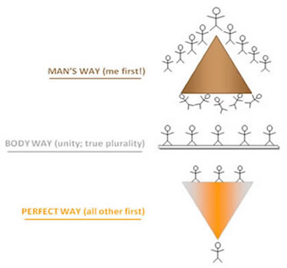 The structure God ordained on the earth was for His children to submit one to another while yielding to the anointing in the midst that God gives for the edification of the Body. This "submitting one to another" should have created an order within the Church that is laid out in what could best be described as a horizontal unity of authority and order. Actually the way Jesus taught it was that if you wanted to be the greatest then you must become a servant or slave to all. In other words, Jesus taught an over-all inverted pyramid structure, one where true power and authority could only come from GOD Himself and was then delegated to those who had no opinion of their own other than to willingly obey the move of the Holy Spirit as it was revealed and confirmed in His Word. This is the very thing that put Jesus at odds with the leaders of His day: MAN WANTS TO RETAIN CONTROL AND POWER AT ALL COST!
