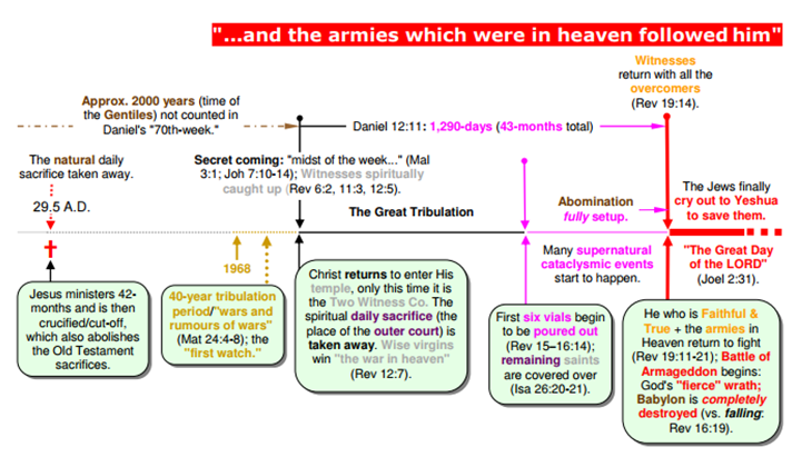Now we come to the 1,290-days spoken of in Daniel 12:11, which in reality is only referring to "one-month" beyond the 42-months. That is because most of the days and months mentioned in Daniel and Revelation, begin at the same point in time, which is at the time of the secret coming/"marriage." Thus, the 43rd and 44.5th-month references in Daniel 12 are nothing more than a progression of the times and events that will continue to unfold after the brethren in the Two Witness Co. are killed, resurrected, and called up to join the Great Cloud of Witnesses who will then all be made perfect/complete. The last of these post great tribulation time periods is called "The Great Day of the LORD," when Matthew 24:30b and post Joel 2:31 events come to pass. "The Battle" of The Great Day of the LORD signifies Armageddon itself. This battle having started after the 1,290-days expire, will end 1,335-days (44.5 months) after the "Groom" arrived secretly and suddenly for His bride at the marriage. We find this 43rd-month during which the Witnesses are "called up," is spoken of in places like Hosea 5:7, Zechariah 11:8, and Revelation 14:14 as the "cloud harvest" of the martyred saints.